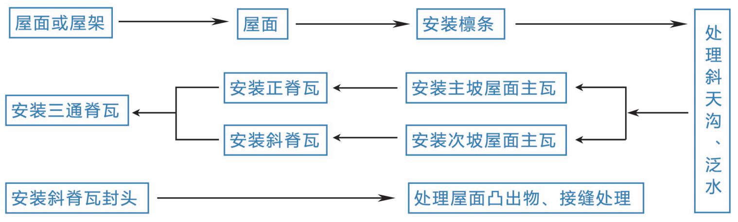正、斜脊瓦安裝搭接處應(yīng)鋸齊,正,斜脊瓦安裝完畢后再安裝三通瓦。